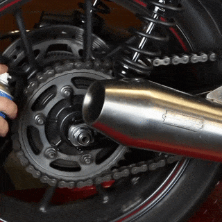 2️⃣ Повдигнете мотора си на висока стойка, завъртете задното колело и започнете да пръскате с равномерна струя от смазващия ни спрей. Накрая подсушете излишното количество с памучна кърпа.